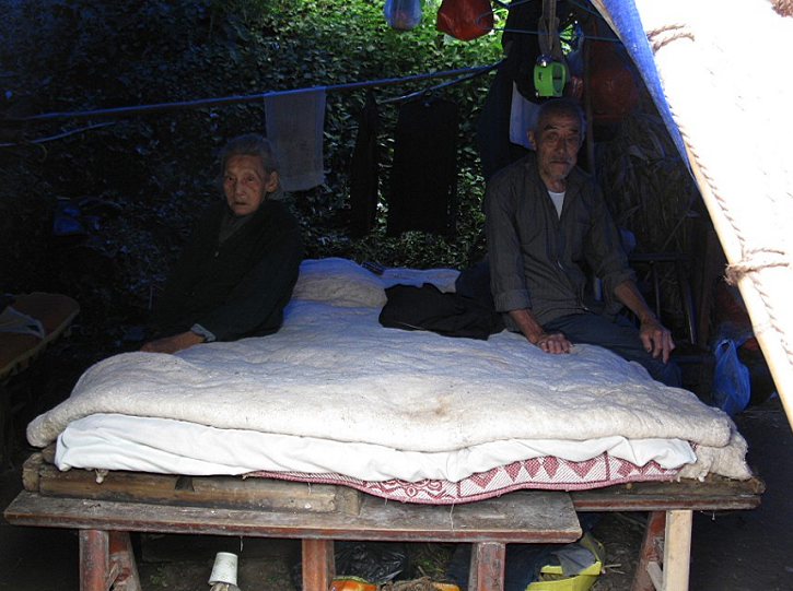 对穷困老夫妇和他们四面漏风、无墙隔风的“卧室”。