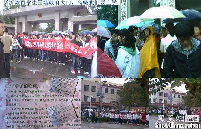 2011年9月28日上午,江苏省新沂市政府门口人头攒动,近六百余名自称是江苏省新沂市第二中学的学生集结在市政府门口,高举“我们要公立、我们要老师、我们要学习、我们要高考”的标语。莘莘学子的心声,异口同声的“决不妥协”口号此起彼伏,令围观市民们议论纷纷。
