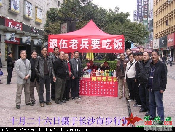 时间大约到了将近下午1点,退伍军人们拿着横幅“退伍老兵要饭吃.....”从书院路的大椿桥(也就是天心区城管队的出口马路)开始游行再到步行街大约2、3公里,由于天气不好,加之吃饭时间人员少了很多,最后,退伍军人们主动撤离了。