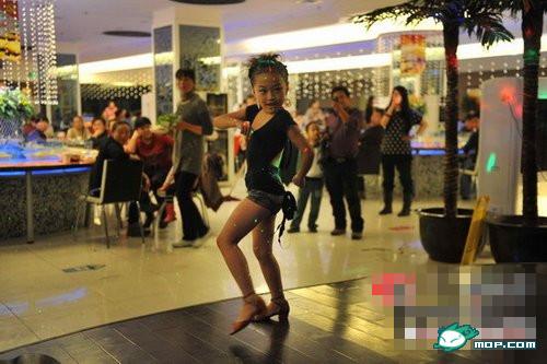 10月26日,演出台上黄豆豆正在给来这里吃火锅的消费者跳拉丁舞,艳丽的服饰和妆容和她这个7岁的年龄有点不相符合。