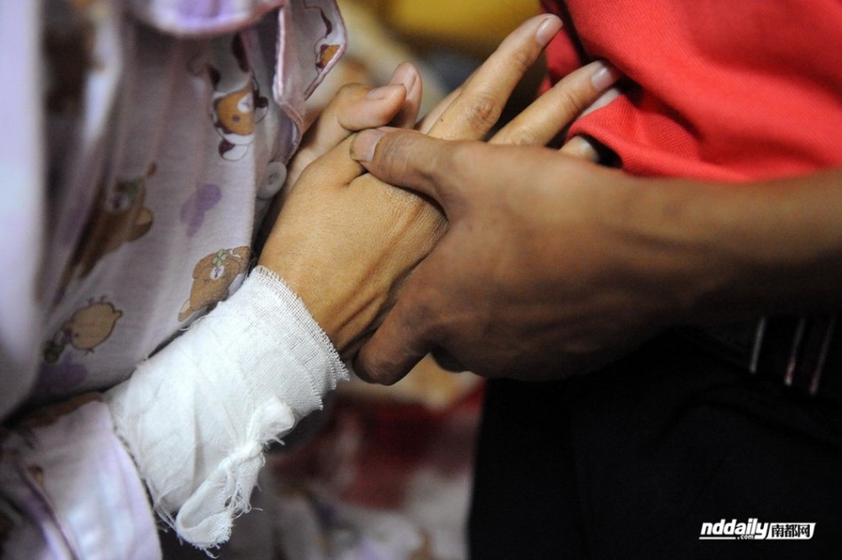 7日中午,西乡河东社区,杨武(化名)和妻子王娟(化名)绝望无助相拥而泣,她手腕上自杀的伤口被纱布抱着。