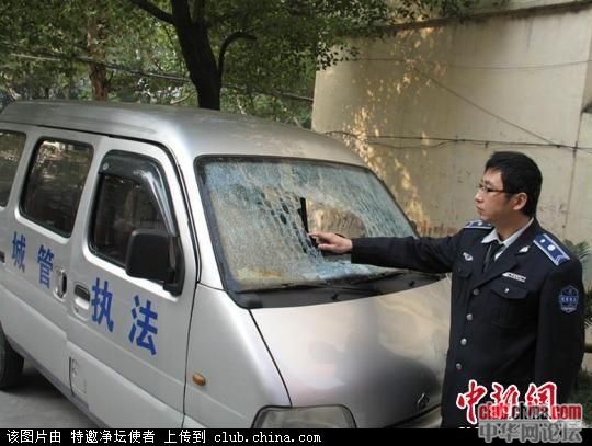 中新网宜昌11月12日电 (高炜)湖北宜昌市城管局伍家岗大队执法人员11日在城区万达路治理占道经营,突然遭到弹弓袭击,6名队员全部被射出的石块、钢珠打中,一队员头被打破入院缝了2针,现场执法车辆挡风玻璃被打穿,随即粉碎。